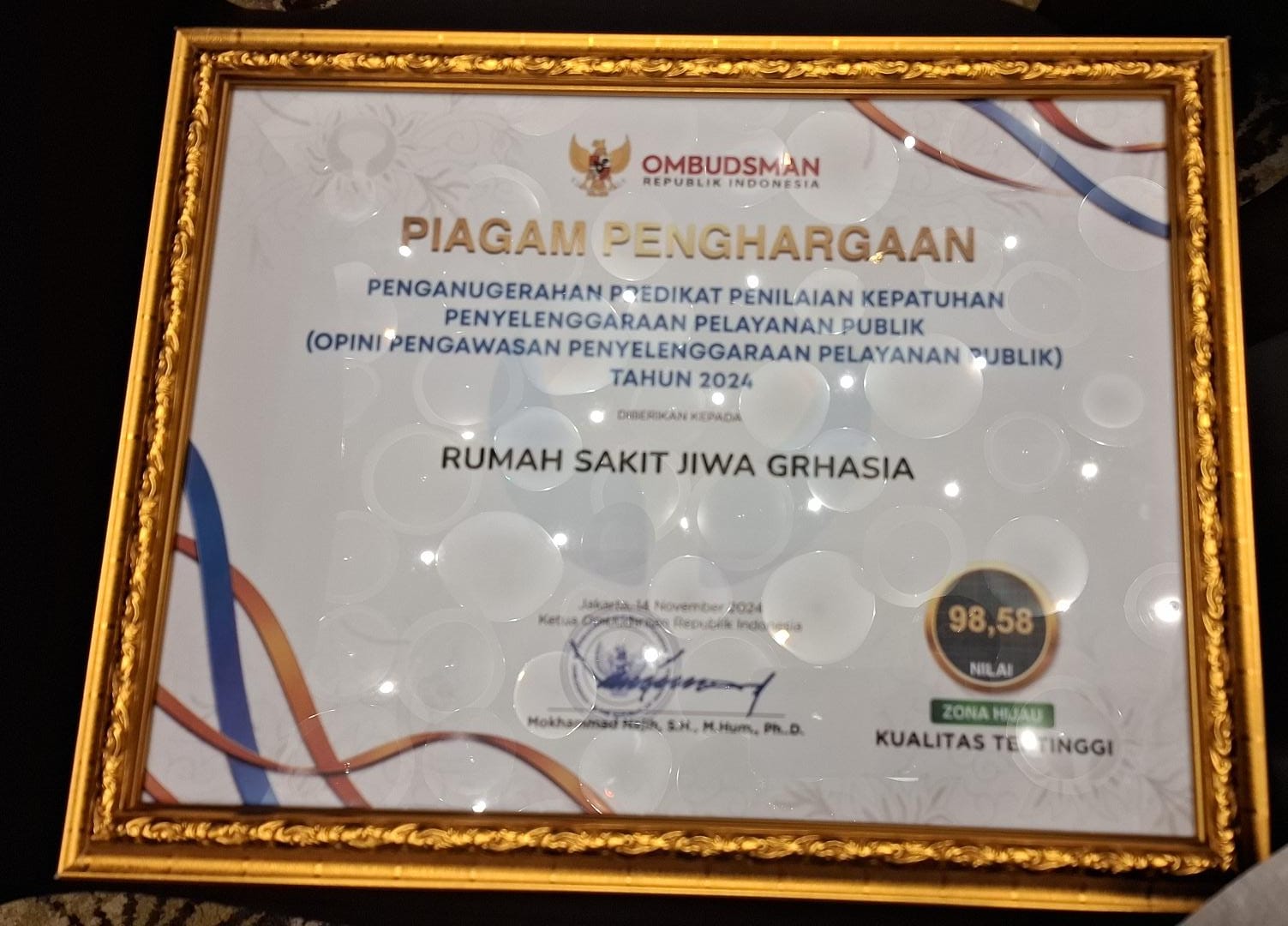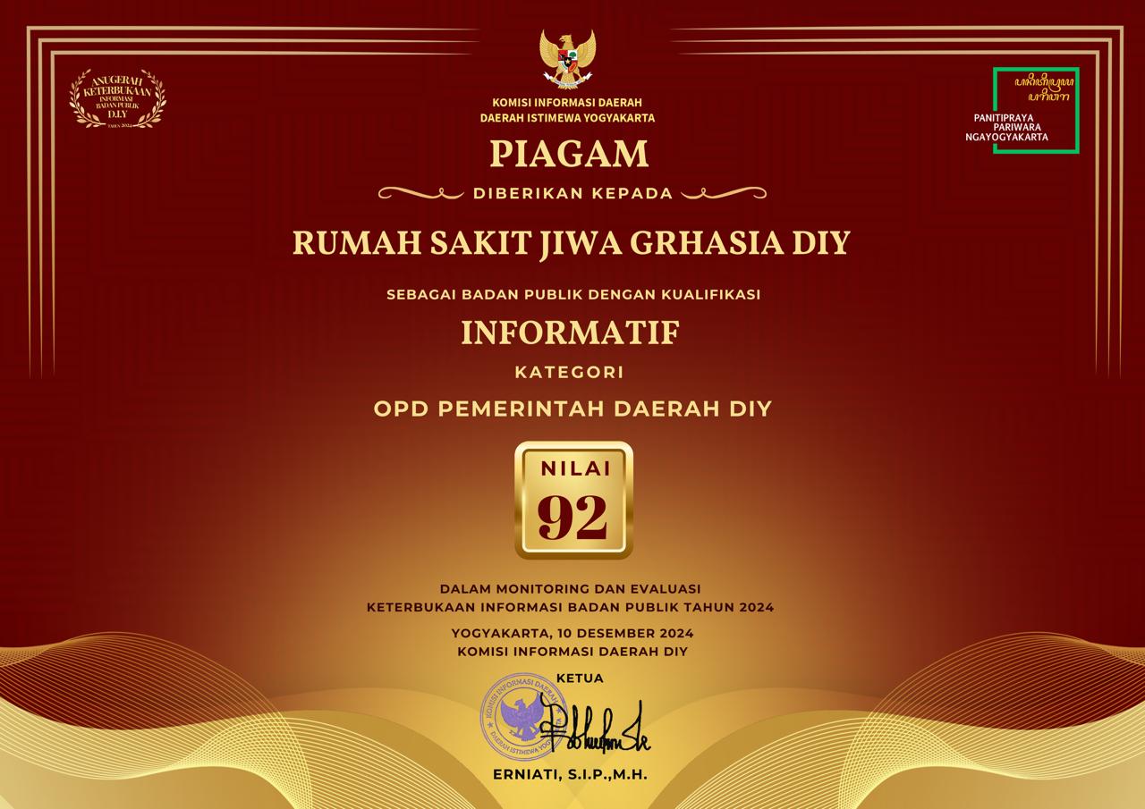 Piagam penghargaan diberikan kepada Rumah Sakit Jiwa Grhasia DIY sebagai Badan Publik dengan kualifikasi Informatif kategori OPD Pemerintah Daerah DIY Tahun 2024.