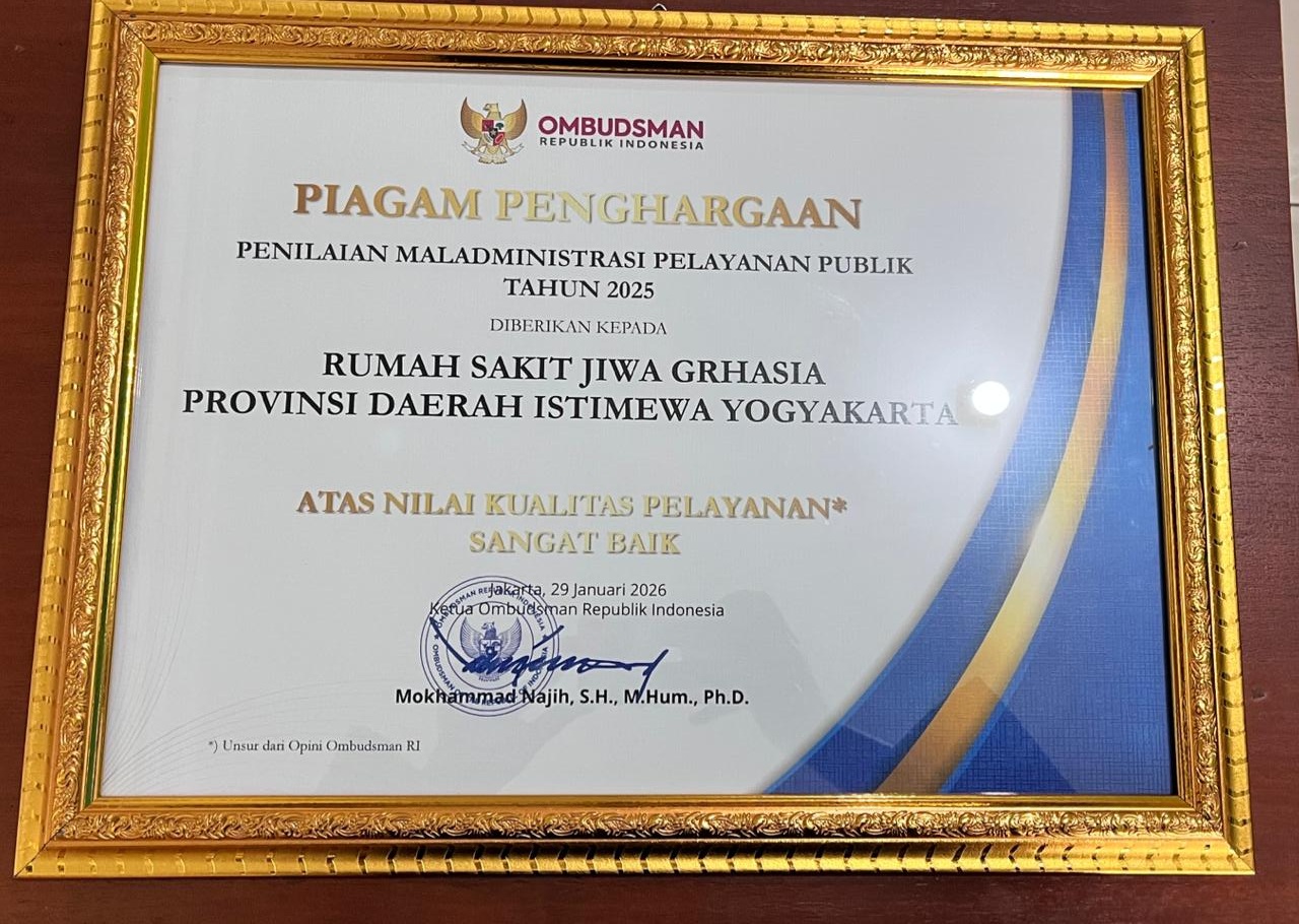 Piagam penghargaan diberikan kepada Rumah Sakit Jiwa Grhasia DIY sebagai Apresiasi PPID/PLID Berprestasi Dalam Monitoring dan Evaluasi Keterbukaan Informasi Badan Publik Tahun 2025.